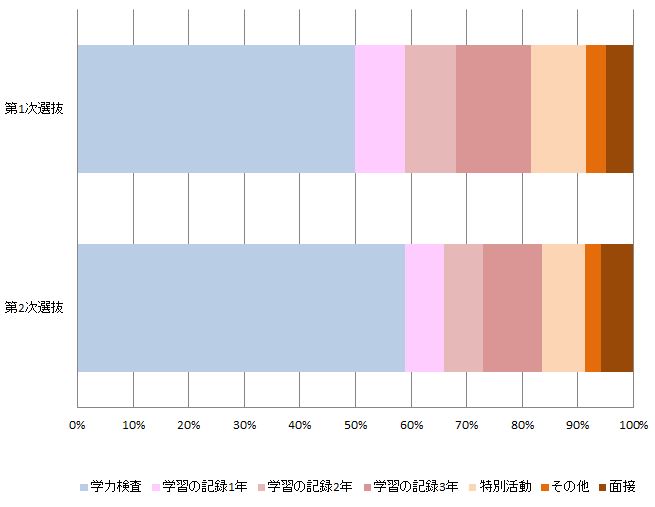 大宮商業高校の第1次選抜と第2次選抜の選抜資料の比率をイメージ化しています。第1次選抜では学力検査の比重は50.0%です。第2次選抜では約58.8%と上がり、学力検査の結果がより重視されます。